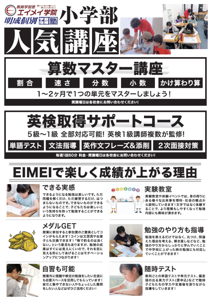 定期テスト対策、受験対策に強いエイメイ学院なら、生徒のやる気をとことん引き出し目標達成まで導きます。プロ講師陣による自慢の授業と親身なサポートで、勉強する姿勢を身に付けます。