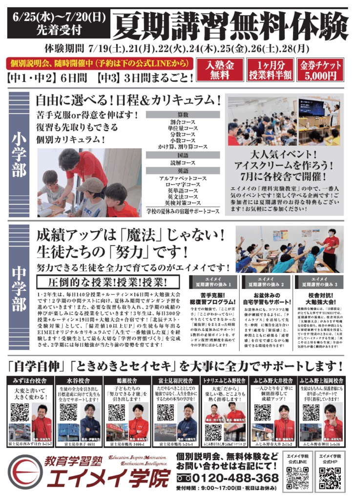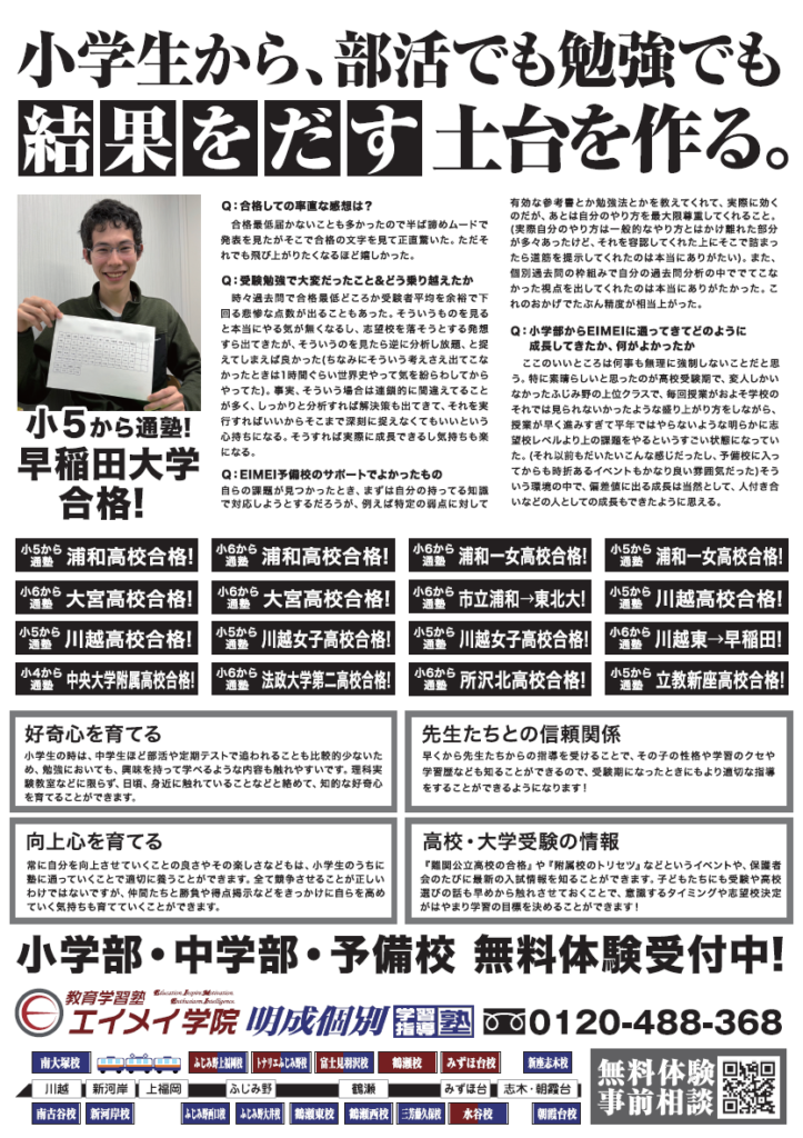 塾長の飯塚です。 僕は今、毎日、朝から夜までエイメイ学院ソヨカふじみ野教室という学習塾で命を燃やしている。命をかけてこのふじみ野西口地域に塾を開いた理由はひとつ。子どもたちの学力を上げるためだ。そして学力を上げていく過程を通して、子どもたちが生きたい人生を生き、社会で活躍していく、 そのための必要な力を、全力で勉強や受験と向き合うことを通して身につけてほしい。 その想いを一人でも多くの生徒と、一人でも多くの保護者様と、一人でも多くの先生たちと、ともに実現していく努力をしていきたい、そう決意して、今日も情熱を燃やしている。 エイメイには、一生懸命に頑張っている仲間たちがいる。勉強が得意な生徒も苦手な仲間たちもいる。学校行事や部活動、習い事と勉強を両立しようと頑張っている仲間たちもいる。 良き仲間(ライバル)の存在は、自分を刺激してくれる。仲間(ライバル)だけじゃない。 エイメイには、人生を変えてしまうような情熱を持った先生たちがいる。 「勉強」のイメージが180度、変わってしまうような体験が待っているかもしれない。一度きりしかない人生をエイメイで情熱を燃やしてみないか。 本気で自分を変えたい、成績を伸ばしていきたい、今の自分に満足していない、そう思ってるなら、自分を変える絶好のチャンスだ。 本気の努力をエイメイでして、自分の人生を劇的に変えてみないか。