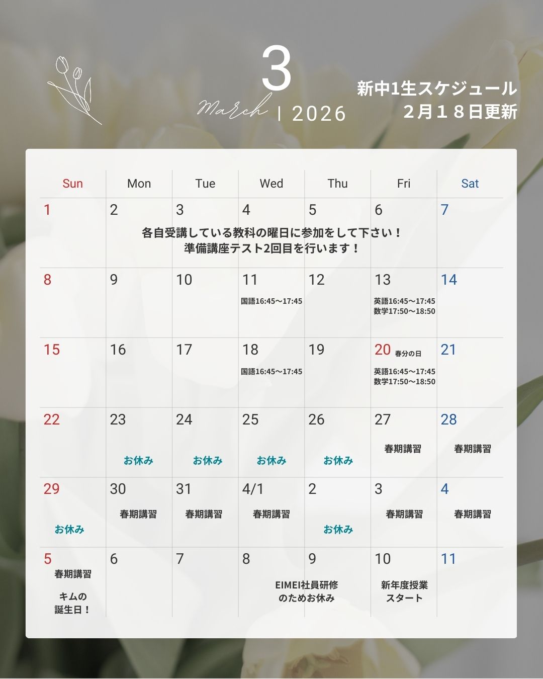 2月は受験に向けて一色になりますので、ここで一旦、先に3月の予定を再度共有します🙇♂️ なお3月は全員、高校準備生(無料)ですので全員通塾してください🔥 === ▼3/7(土)13:00〜15:00 中学部修了式&am […] -