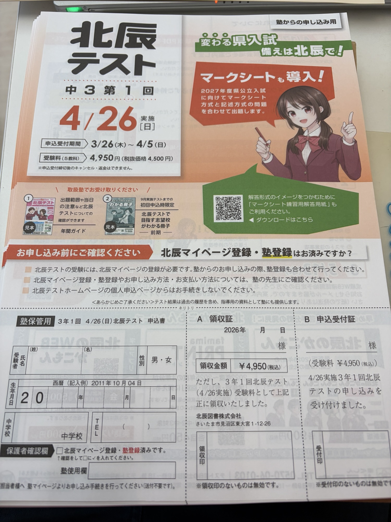 4月26日(日)実施の「第1回 北辰テスト」の案内が届きました 授業にて、写真の申込用紙を配布してまいります また、コチラの冊子も配布していきます これは北辰テストの範囲や日程等が載っていますので保存版です […] -