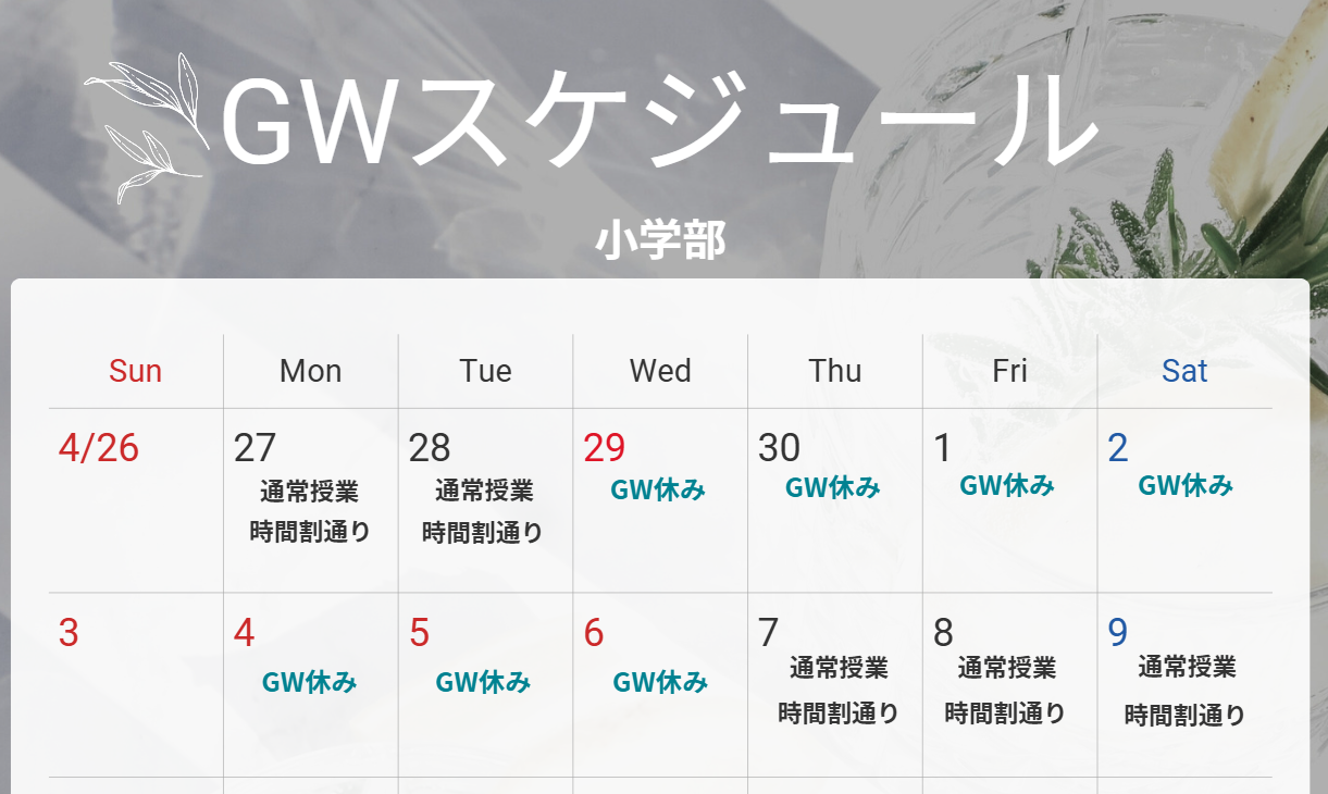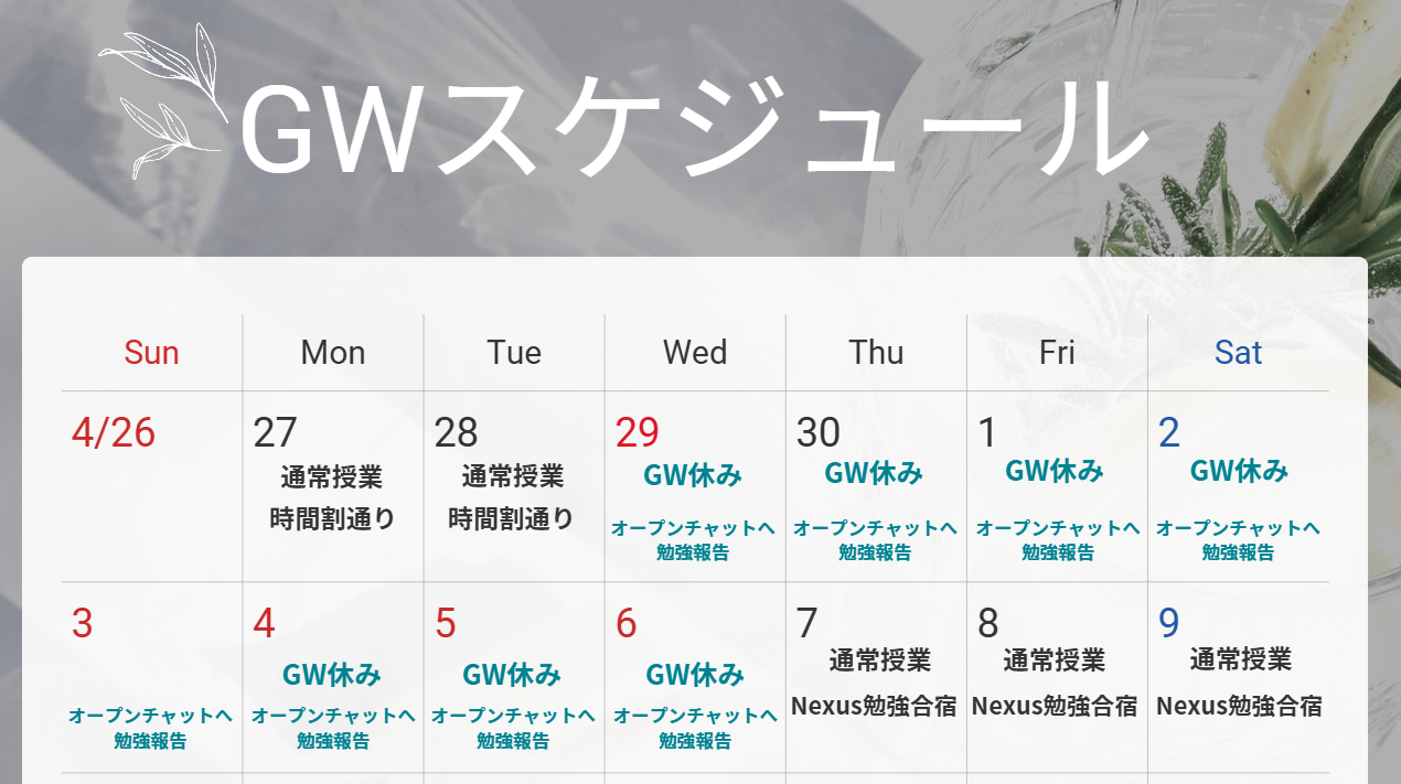 2026/04/04時点 前回から変更あり 4月30日が休み→通常授業ありになっています! -