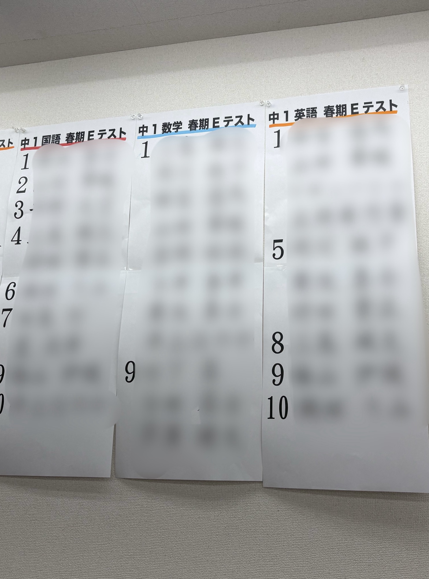 春休みの最後に行ったEテストの順位を教室に貼り出しました! 各教科ごとの結果で順位を出しています! ブログでは、3教科の合計得点で表彰します! 3科合計順位🥇 1位 H.T.くん 2位 Y.H.さん 3位 M. […] -