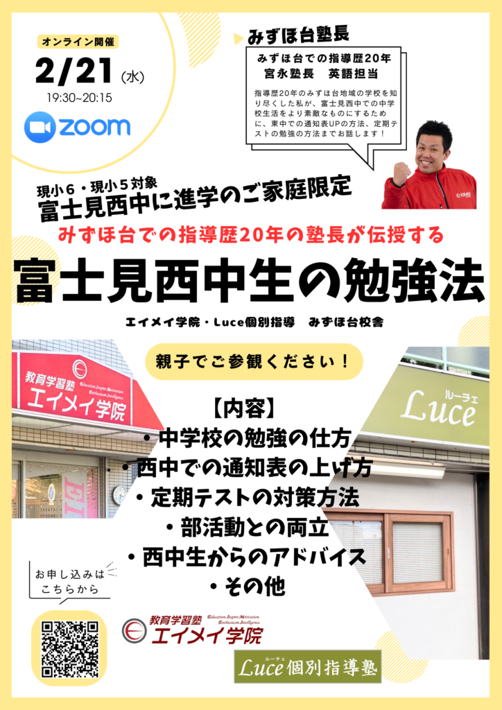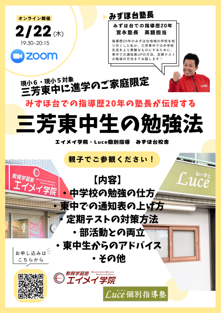 【みずほ台】中学進学を控える小学生のご家庭へ 投稿日 2024年2月1日 著者 宮永 裕介 カテゴリー Luce個別指導塾みずほ台校舎 カテゴリー エイメイ学院みずほ台校舎ブログ カテゴリー 宮永裕介|エイメイ学院みずほ台塾長 カテゴリー 新着情報 みずほ台校舎のメイン中学校は、 富士見西中学校と三芳東中学校です! お兄さんやお姉さんのきょうだいがいらっしゃるご家庭は、 どんな中学校生活になるかのイメージはついているかと思いますが、 そうでないご家庭は、今の中学生がどんな風に過ごしているのか? どんなことが大変なのか? わからないですよね? そこで、こんなことしちゃいます! お友達とご一緒にぜひご視聴ください! こちらからもお申し込みできます! ↓ みずほ台での指導歴20年の塾長が教える中学生の勉強法docs.google.com シェア ツイート LINE この記事を書いた人 宮永 裕介 記事一覧