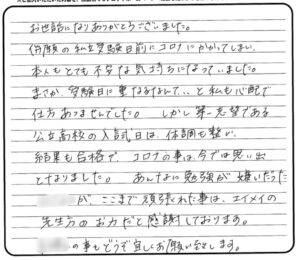 自分たちだけではこの受験を乗り越えることはできなかったと思います。本当にありがとうございました。