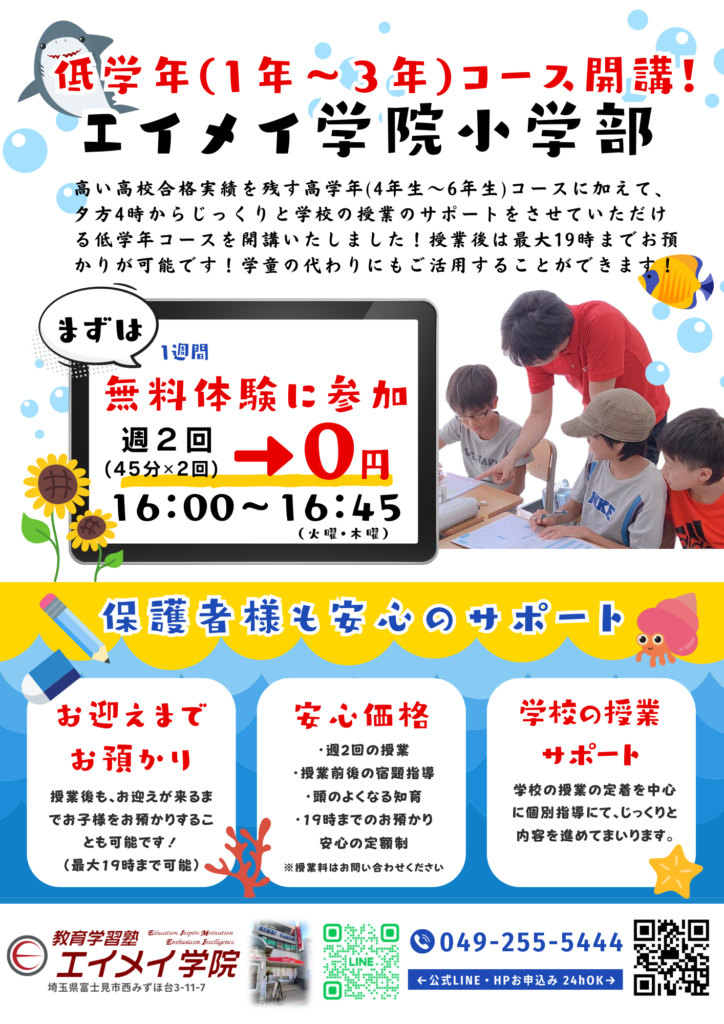【みずほ台ミヤ】小学校低学年(小1~小3)コース開設! 投稿日 2024年5月23日 著者 宮永 裕介 カテゴリー エイメイ学院みずほ台校舎ブログ カテゴリー 宮永裕介|エイメイ学院みずほ台塾長 現在エイメイ学院みずほ台校舎では、 小学3年生から小学6年生までの14人の生徒たちが一生懸命に授業に参加してくれています! もっと早くからエイメイに預けたい、学童の代わりに勉強の面倒も見て欲しい! など多くの要望が寄せられましたので、 小学校低学年(小1~小3)コースを 6月よりスタートいたします! 通常の小学部のコースも選択できますので、ぜひ一度お話を聞きに来てください! シェア ツイート LINE この記事を書いた人 宮永 裕介 記事一覧