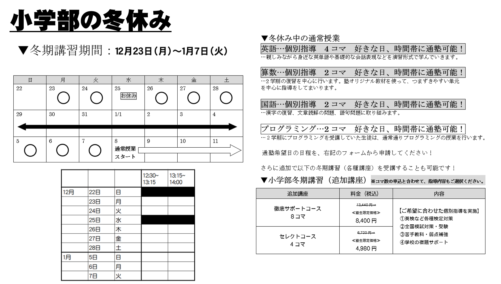 また、エイメイの小学部の冬は、完全個別指導形式!