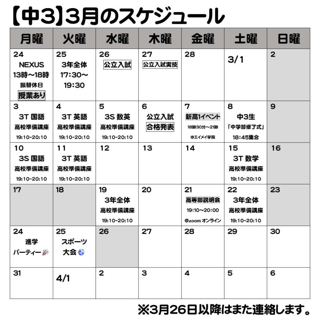 【中3】3月のスケジュール🆕 投稿日 2025年2月25日 著者 けんご(ごーけん) カテゴリー エイメイ学院トナリエふじみ野(旧ソヨカ)校舎ブログ カテゴリー お知らせブログ|エイメイ学院トナリエふじみ野(旧ソヨカ)校舎 中3生(新高1生)3月のスケジュールになります! 春期講習以降はまたご連絡いたします! シェア ツイート LINE この記事を書いた人 けんご(ごーけん) 記事一覧
