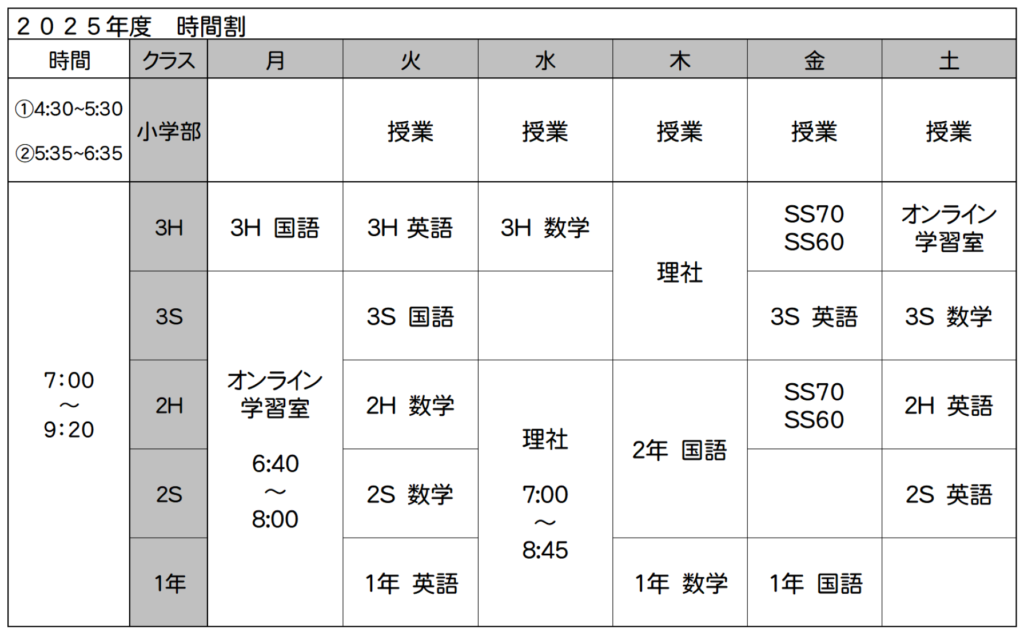 2025年4月以降のクラス別の時間割は写真の通りです!