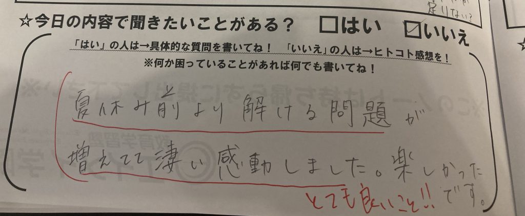 嬉しいことばを生徒からいただきました 投稿日 2021年9月9日 著者 川上 大樹 HIRO先生 カテゴリー 新着情報 カテゴリー 飯塚塾長のブログ|エイメイ学院ソヨカふじみ野 授業後の記録ノートにこんなことが書かれていました! 夏期講習、頑張った成果が出てきましたね(^^) 二学期も頑張りましょう! シェア ツイート LINE この記事を書いた人 川上 大樹 HIRO先生 記事一覧