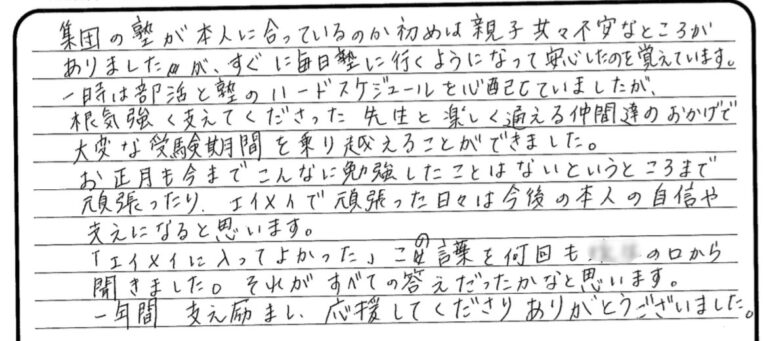 【ふじみ野校】「親から見たエイメイ」~受験を終えた保護者から シリーズ⑭~ 投稿日 2022年4月8日 更新日 2022年4月9日 著者 kimu カテゴリー エイメイ学院ふじみ野校舎ブログ カテゴリー キムのブログ|エイメイ学院ふじみ野塾長 カテゴリー 新着情報 本日はとても素敵な修了式を行っていただきありがとうございました。エイメイに通い約4年が経ちましたがこの4年で子供は大きく成長したと思います。子供に向き合い、優しく温かく見守って下さった先生方に感謝の気持ちで一杯です。エイメイに通わせて本当に良かったと思っています。ありがとうございました。 シェア ツイート LINE この記事を書いた人 kimu 記事一覧