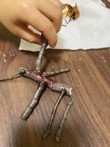 木の枝と落ち葉を拾ってきて、なんか、ノリでつけようとして、テーブルは汚れるし、落ち葉はばら撒くし。笑