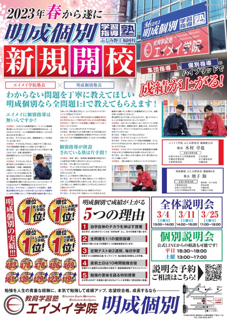【新規開校】ふじみ野駅東口と上福岡駅東口の間に個別指導塾開校!明成個別ふじみ野上福岡校舎 投稿日 2023年3月6日 著者 川上 大樹 HIRO先生 カテゴリー エイメイ学院ふじみ野校舎ブログ カテゴリー 代表のブログ カテゴリー 新着情報 2023年「春」 ついに、明成個別ふじみ野上福岡校舎開校! 現、エイメイ学院ふじみ野校舎に併設という形で開校します! 無料体験申込み受付開始します!以下よりお問い合わせください! ふじみ野上福岡校舎/明成個別学習指導塾 ふじみ野市|富士見市| 志木市| さいたま市| 三芳町| みずほ台駅徒歩8分の学習塾。集団指導と個別指導で成績… meiseikobetsu.jp シェア ツイート LINE この記事を書いた人 川上 大樹 HIRO先生 記事一覧