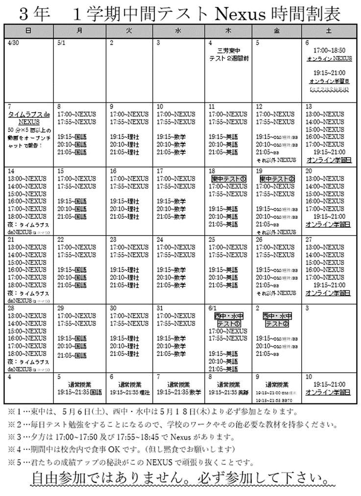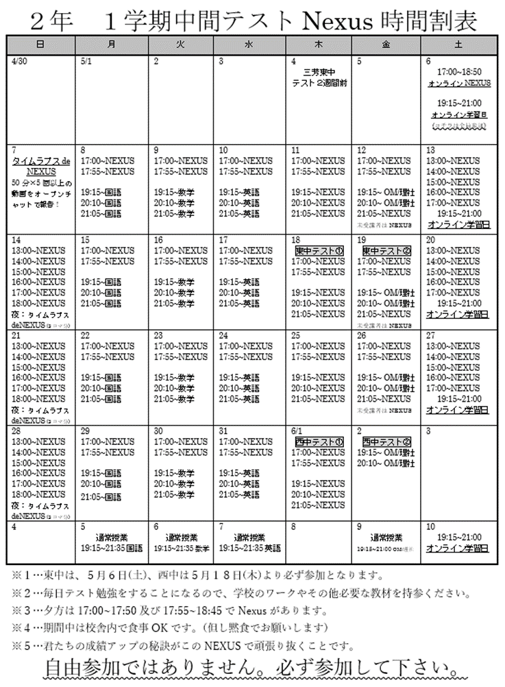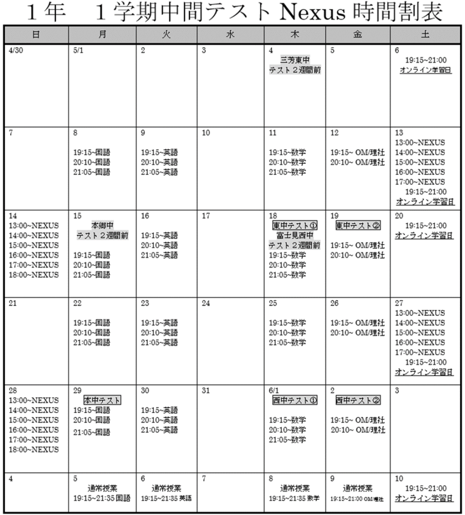 【みずほ台】5/6(土)スタート NEXUS時間割