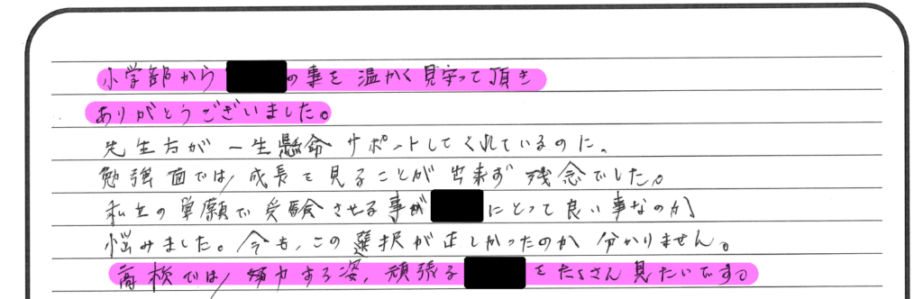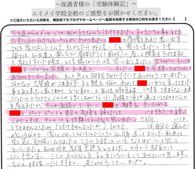 【ふじみ野】「親から見たエイメイ」 ~保護者様の受験体験記⑱~2024 投稿日 2024年3月11日 著者 おいたん カテゴリー エイメイ学院ふじみ野校舎ブログ カテゴリー おいたんのブログ カテゴリー ふじみ野上福岡校舎 小学部から息子の事を温かく見守って頂きありがとうございました。 先生方が一生懸命サポートしてくれているのに。 勉強面では、成長を見ることが出来ず残念でした。 私立の単願で受験させる事が息子にとって良い事なのか悩みました。 今もこの選択が正しかったのか分かりません。 高校では、努力する姿、頑張る息子をたくさん見たいです。 シェア ツイート LINE この記事を書いた人 おいたん 記事一覧