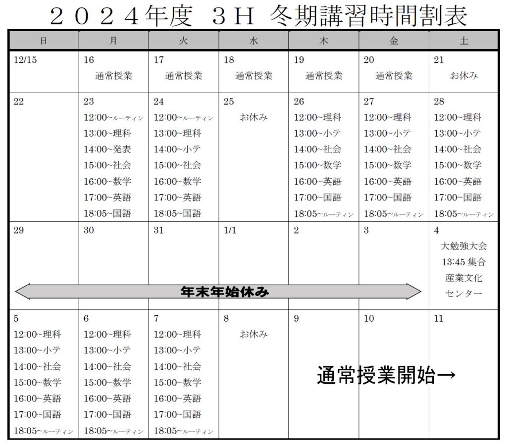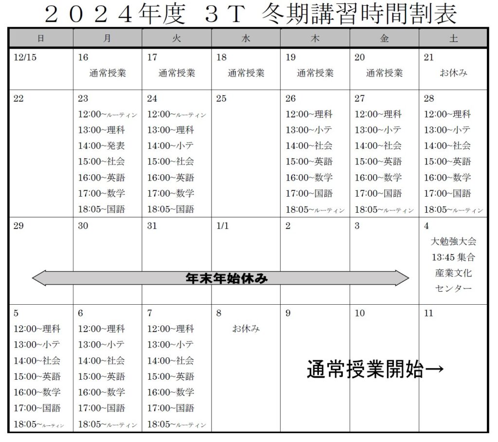 ・基本的には質問や補習は随時行っておりますが,冬期講習中は連続で授業があったり、移動があったりと、担当の先生がいつもいるわけではありませんので、質問や補習は、なるべく予約をしてください。