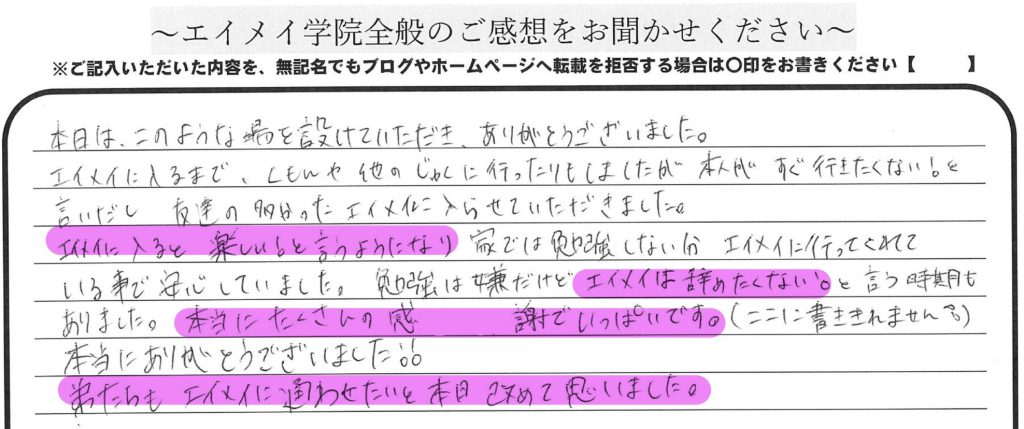 エイメイに入ると楽しい!と言うようになり家では勉強しない分