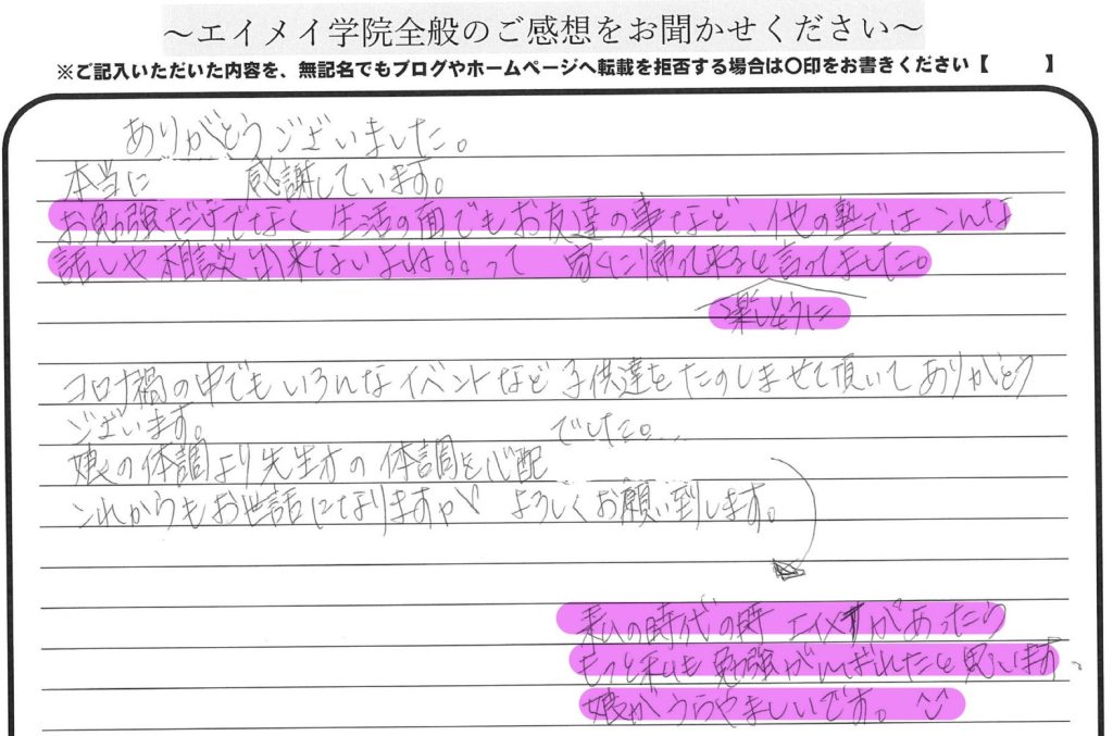 お勉強だけでなく生活面でもお友達の事など、他の塾ではこんな話や相談は出来ないよね!って家に帰って来ると楽しそうに言っていました。