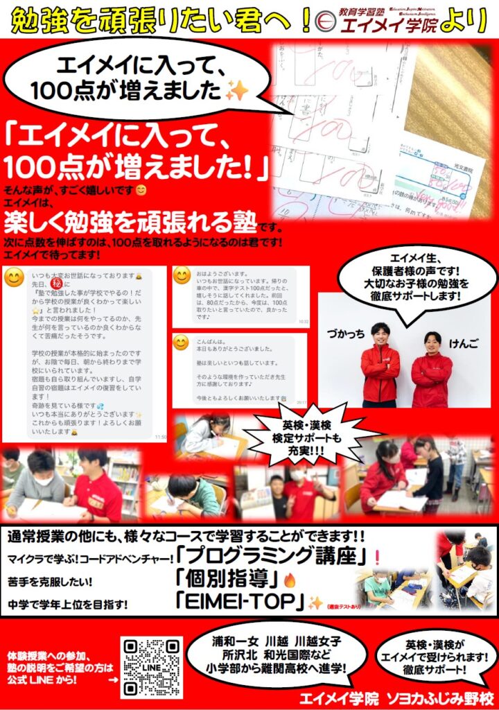 エイメイ トナリエふじみ野校舎がどんな塾かはまずは動画を御覧ください!