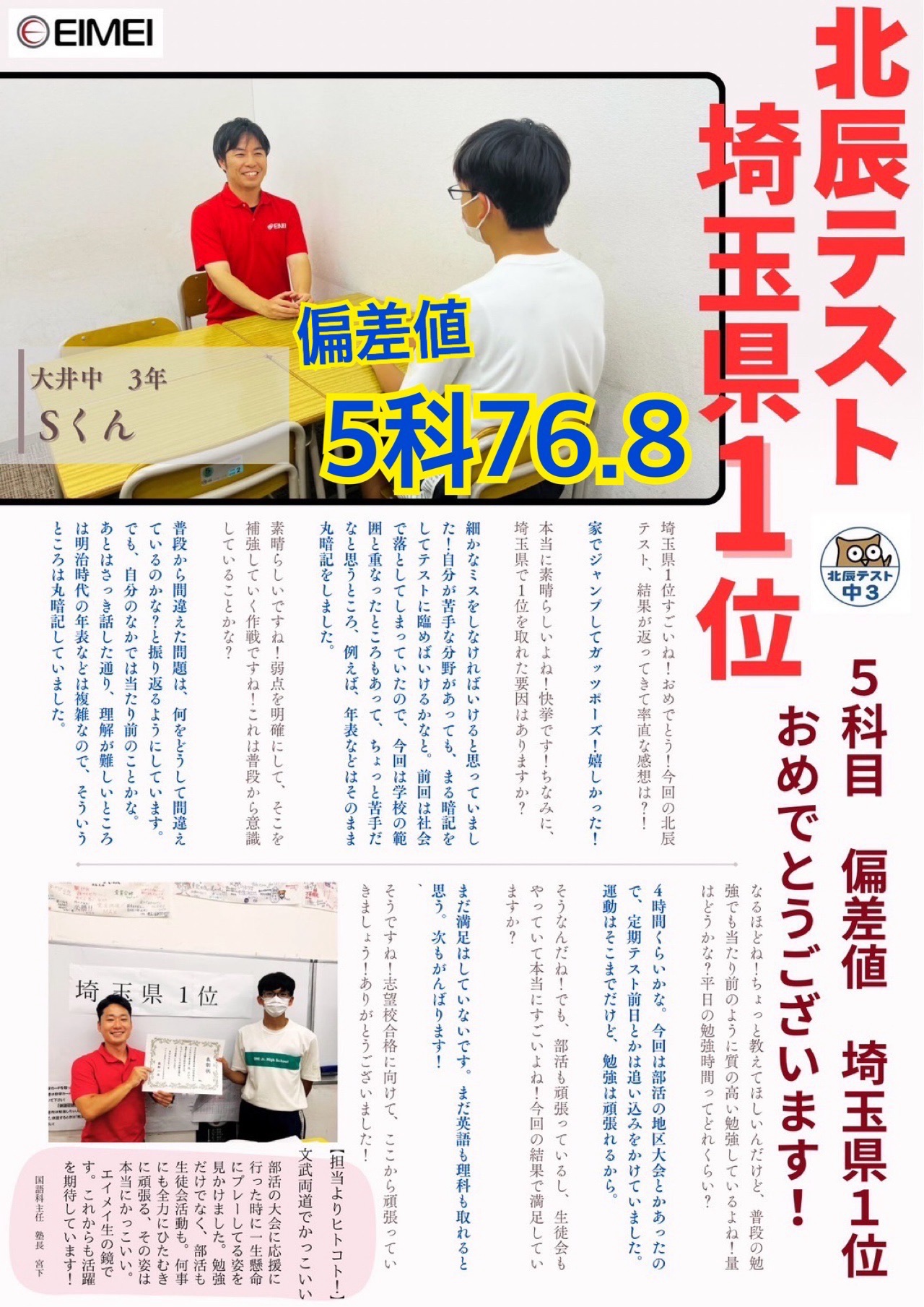 【速報!!】出ました!!北辰テスト埼玉県で五科目総合1位!