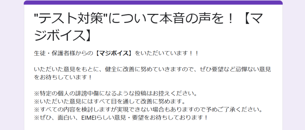 生徒・保護者からいただいた意見をもとに、健全に改善に努めていきます!