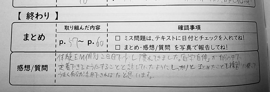 今までのEM個別では、先生が全問題をチェックし、生徒のわからなかったところを質問して、説明する。