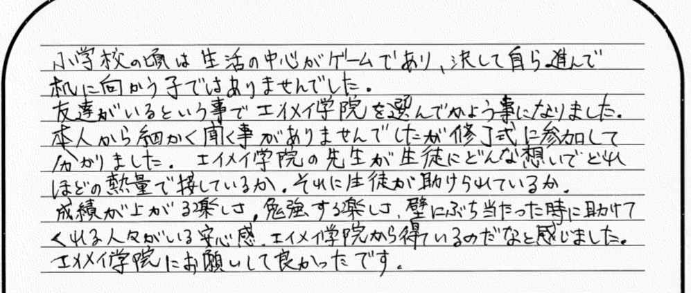 成績が上がる楽しさ勉強する楽しさ壁にぶち当たった時に助けてくれる人々がいる安心感、エイメイ学院から得ているのだなと感じました。