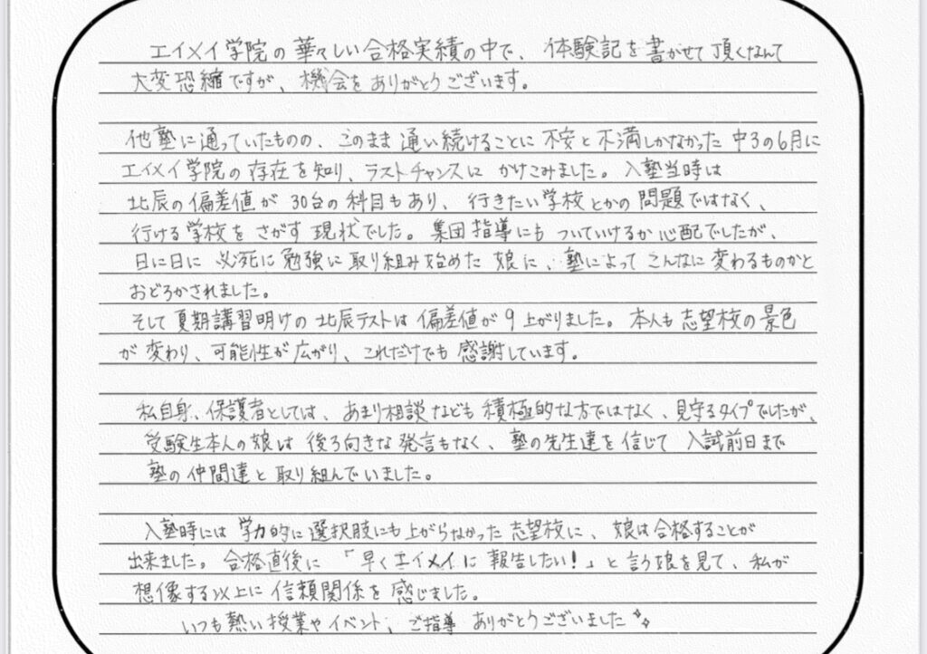 他塾に通っていたものの、このまま通い続けることに不安と不満しかなかった中三の六月にエイメイ学院の存在を知り、ラストチャンスに駆け込みました。