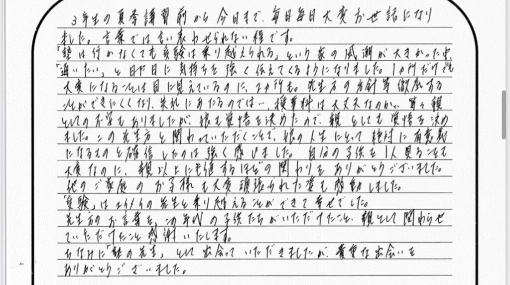 三年生の夏期講習前から今日まで毎日毎日大変お世話になりました。言葉では言い表せないほどです。
