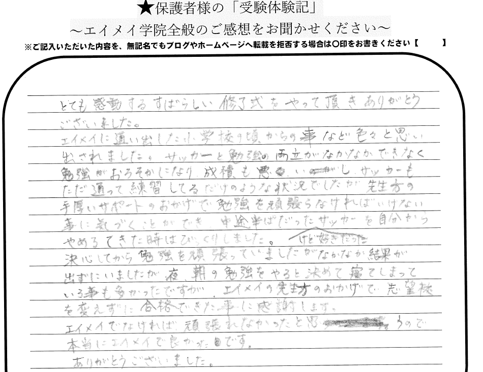 決心してから勉強を頑張っていましたがなかなか結果が出ずにいましたが、夜、朝の勉強をやると決めて寝てしまっていることも多かったですが、エイメイの先生方のお陰で志望校を変えずに合格できたことに感謝します。