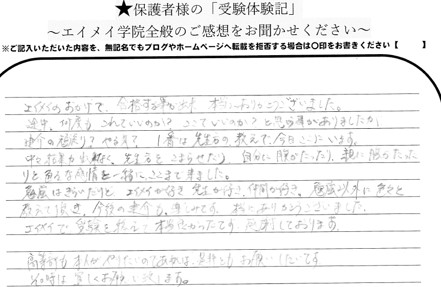 エイメイで受験を終えて本当に良かったです。感謝しております。