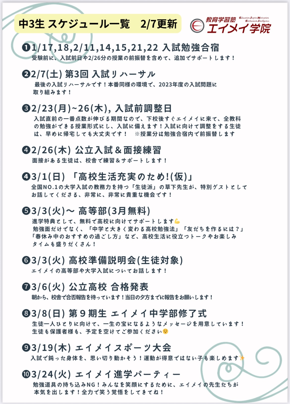 いよいよ2月に入り公立入試まであと3週間 最後の追い込みをサポートしてまいります! 3年生 2月・3月の予定 3月には3年生対象のイベントも多くありますので確認お願いします! 詳細は、その都度公式LINEより […] -