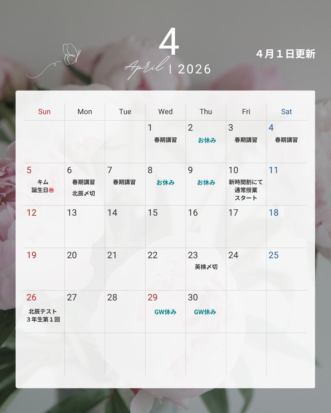 2026/03/18時点 3月26日が前回の共有したものではお休みになっていましたが、講習日程の調整の関係で26日から学年により講習スタートになります!講習期間中の授業の枠や休日は各学年日程表をご覧ください! -