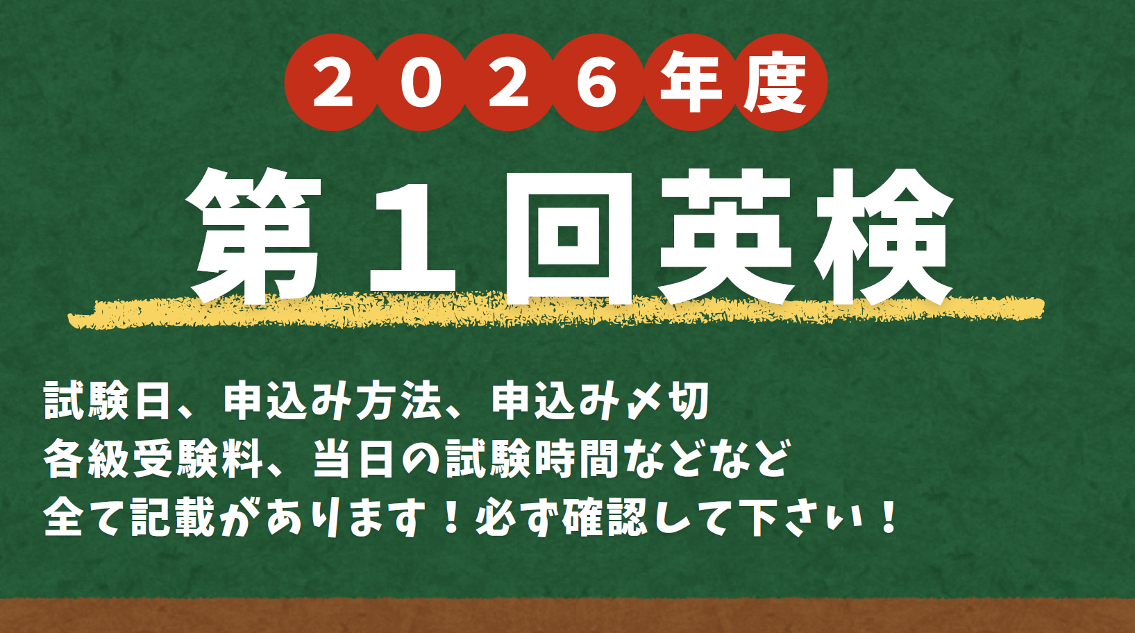 第1回漢検 6月27日(土)実施 ※5月25日(月)申込締切 の申込が開始しました! 受験希望者は各級の受験料をお持ち頂き、 校舎の券売機でご購入下さい! 券売機の半券に 【名前】と【受験級に印】 を記載しない場合は無効 […] -