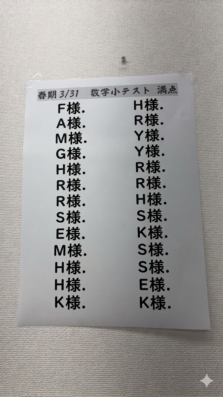 3/31に行った数学の小テストで満点を取った生徒を教室に掲示しています! ブログでは、イニシャルで表彰します(^^) 次回も頑張りましょう! -