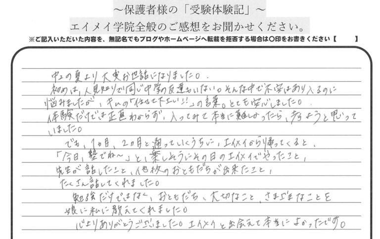 思春期でもありなかなか意思疎通ができず何を考えているのか分からない息子ですが、エイメイに通い、受験を経て、少しですが自分に向き合い自分の意思を伝えてくれるようになりました。