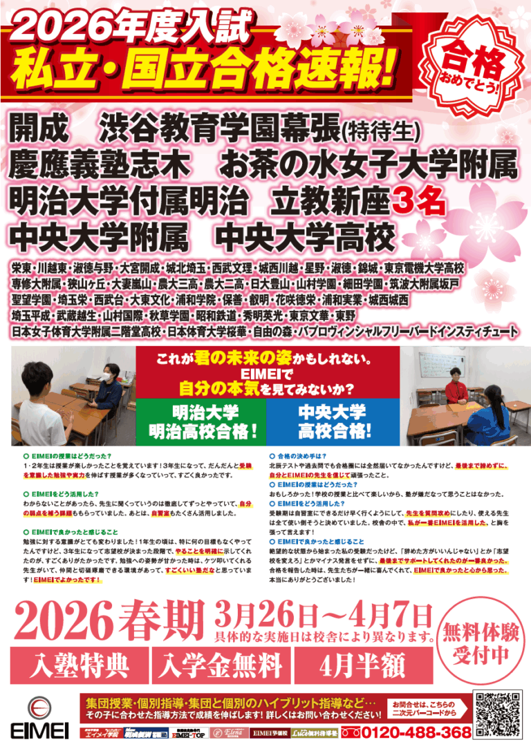 私立入試が一段落し、 校舎には嬉しい合格の報告が続々と届いています🌸 そんな中、今年のEIMEI […]