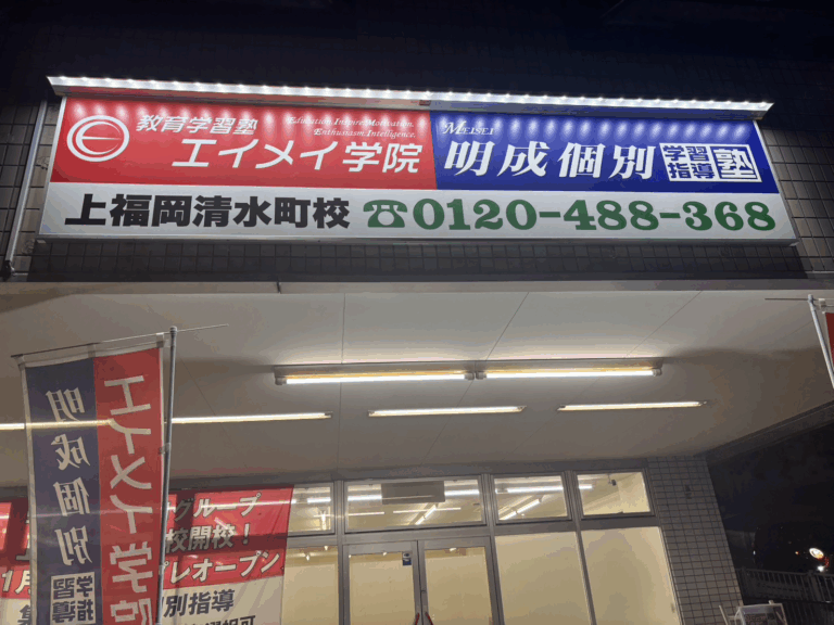 本日、「エイメイ学院/明成個別 上福岡清水町校舎」の外観に、 新しい校舎看板が設置されました! […] -