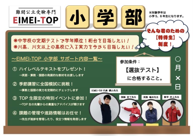 今年度の冬期講習では、 冬期講習カリキュラムに加えて、 EIMEIグループ初、 正月特訓 […] -