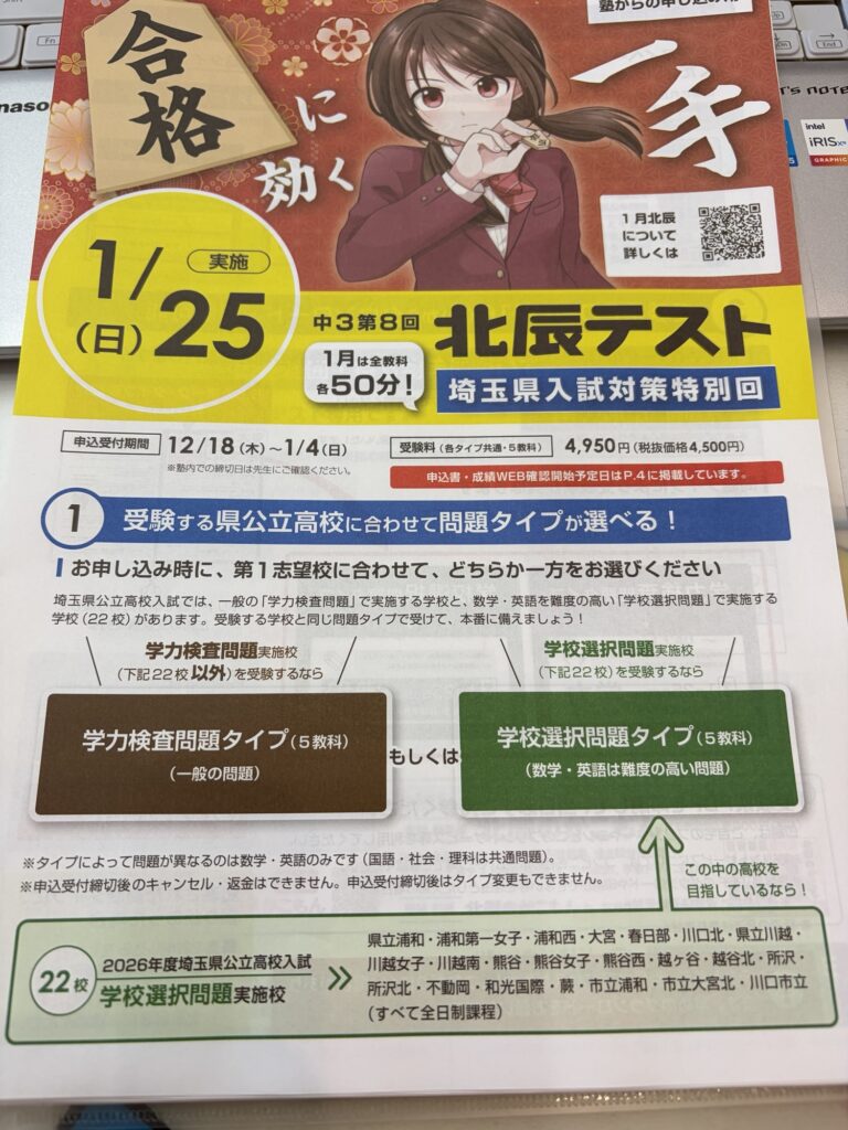 1月25日(日)実施 第8回北辰テストの申込みのお知らせです 今週を通して、写真の案内用紙を配布して […] -