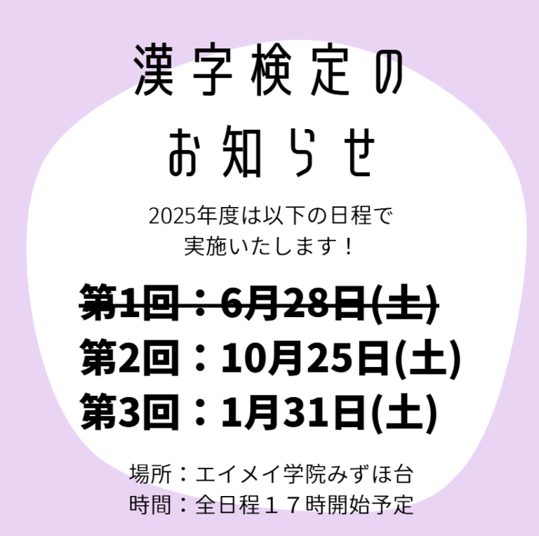 どうもこんにちは、エイメイ学院のASKです✋️ エイメイ学院では、漢字検定を受検することができま […] -