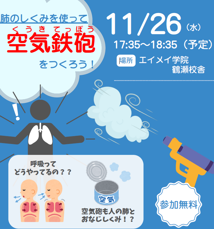 11月26日㈬ 17:35~18:35開催予定です👀 今回は理科実験教室🧪 肺の仕組みをつか […] -