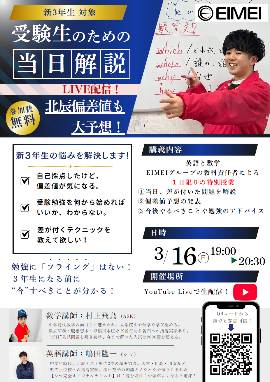 詳しい問題の解説や、今後の勉強法、偏差値予想については、今夜YouTube Liveで行いますので、ぜひ御覧ください👇️