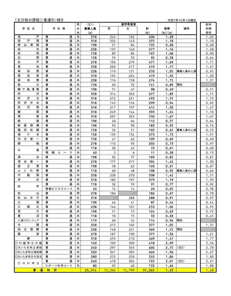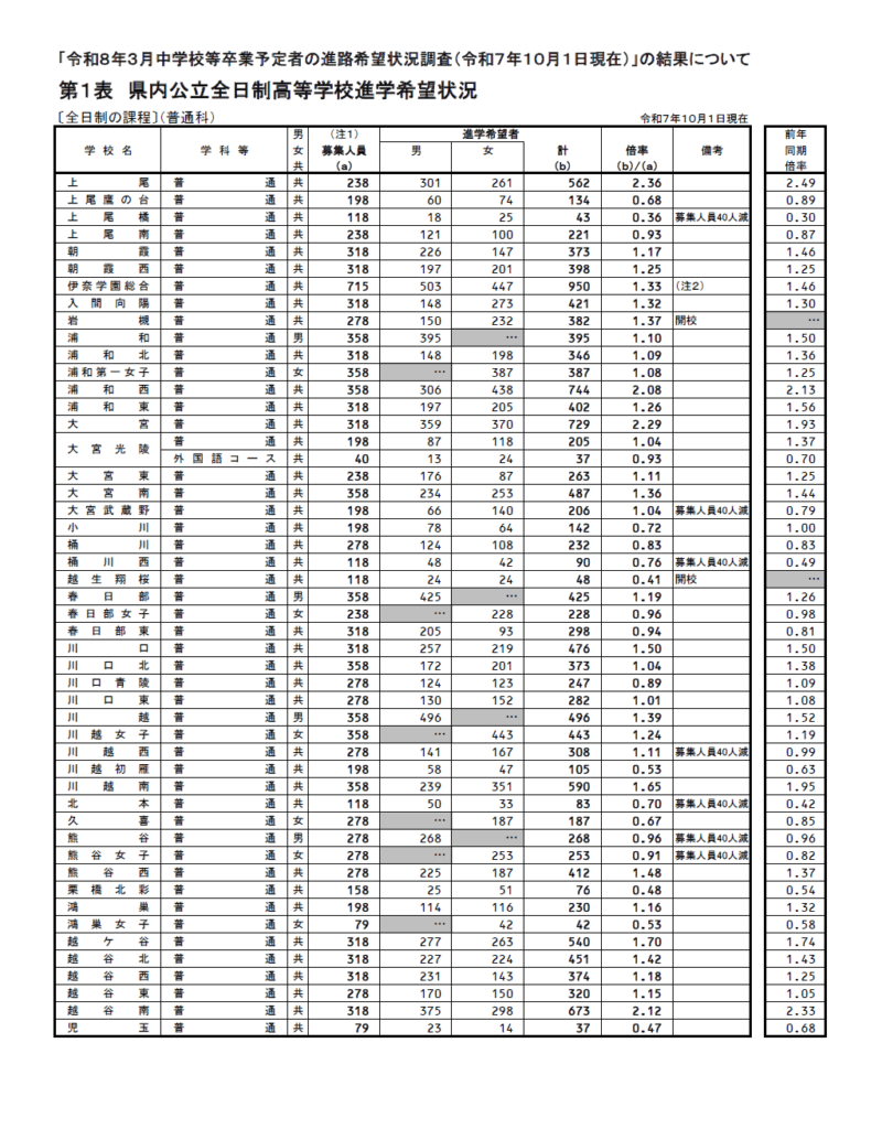 10月1日に各中学校で調査された、埼玉県公立高校の入試倍率速報が出ました!