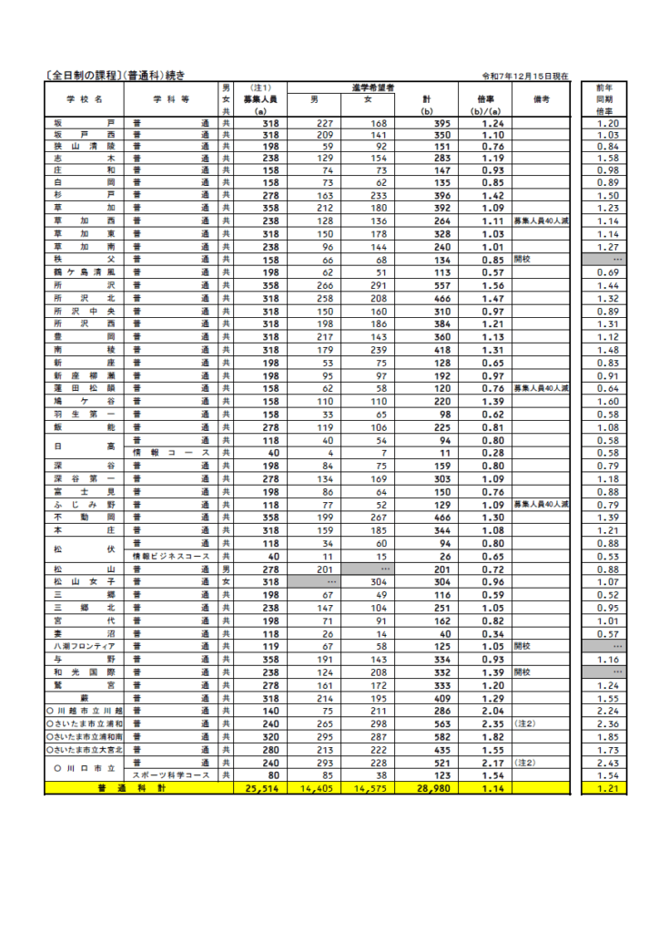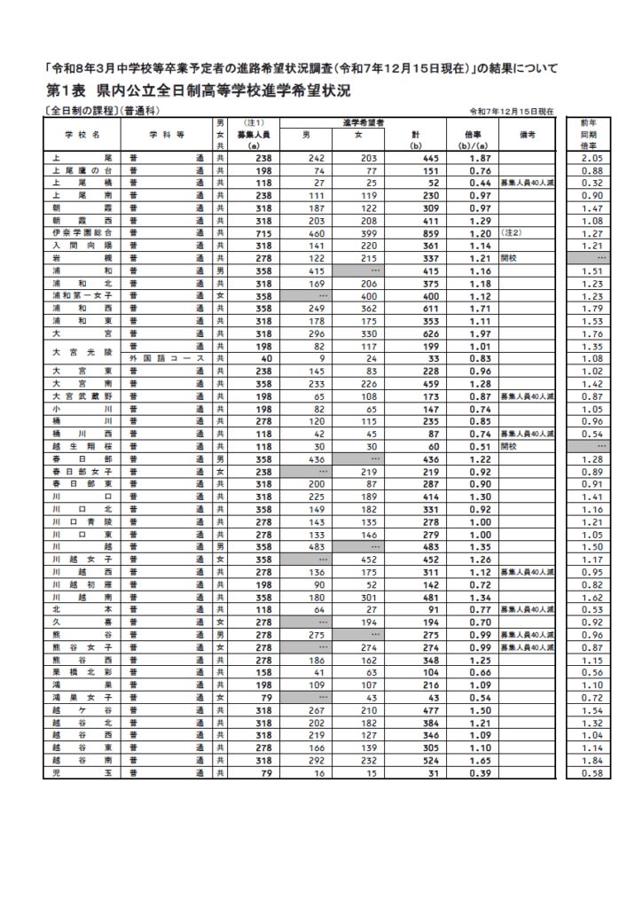 12月15日に各中学校で調査された、埼玉県公立高校の入試倍率速報が出ました!