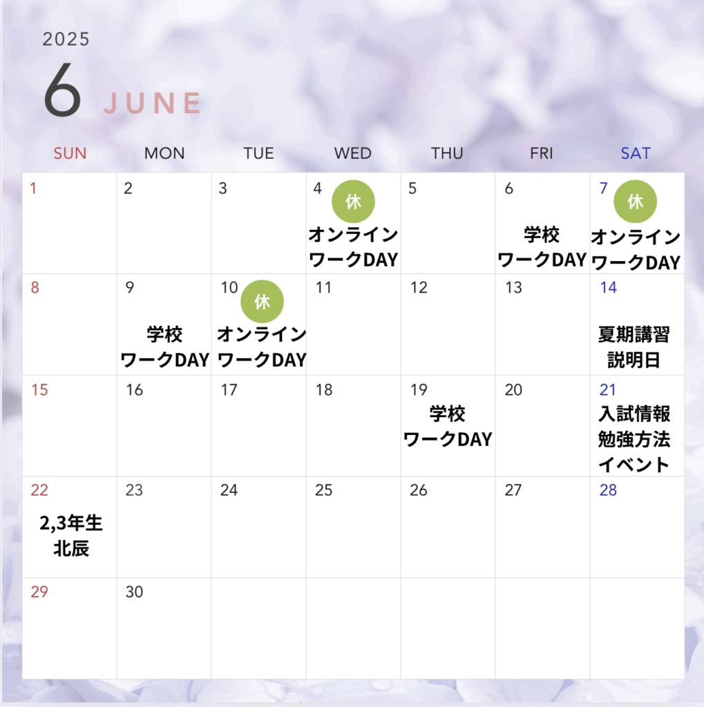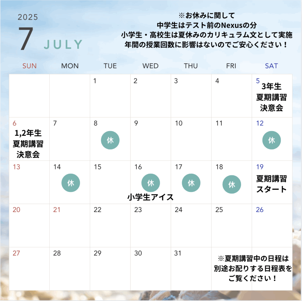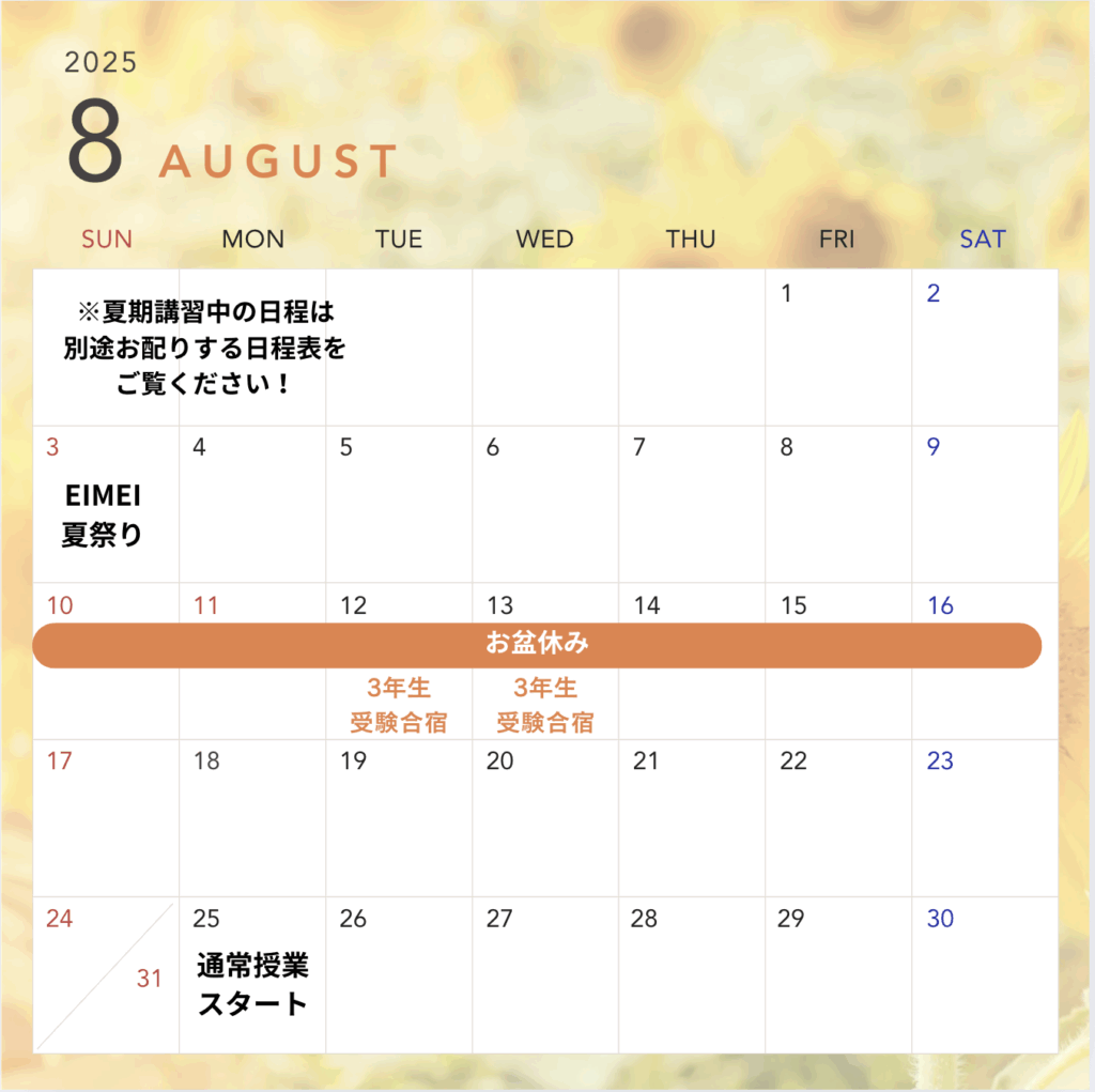 【羽沢】6,7,8月のスケジュール 投稿日 2025年6月16日 著者 ryo カテゴリー 富士見羽沢校舎 カテゴリー 明成個別富士見羽沢校舎 2025/06/16更新 バージョン1 6月 【羽沢】6月スケジュールと詳細2025/05/25更新版 お休みについて 【中学生】定期テスト前のNexus等で多く授業をしている分のお休み…www.eimeigakuin.jp 7月 各種イベントに関しては、以下よりご覧ください! 【羽沢】【中3親子向け】7/5開催「夏期講習決意会」受験の夏を最高のスタートに!いよいよ夏がやってきます。中学3年生にとって、夏は“受験の天王山”。この時期をどう過ごすかで、志望校合格への道…www.eimeigakuin.jp 【羽沢】【中1・中2親子向け】7/6開催「成績アップミーティング summer ver」夏から差をつける準備をしよう!中学生活にも慣れてきたこの時期。 1学期の学びをしっかり振り返り、夏をどう過ごすかが今後の成績や高校受験に大き…www.eimeigakuin.jp 夏期講習の説明は、動画にて簡易説明を行なっております! 8月 こちらも夏期講習期間になりますので、日程表はそちらをご覧ください! シェア ツイート LINE この記事を書いた人 ryo 記事一覧