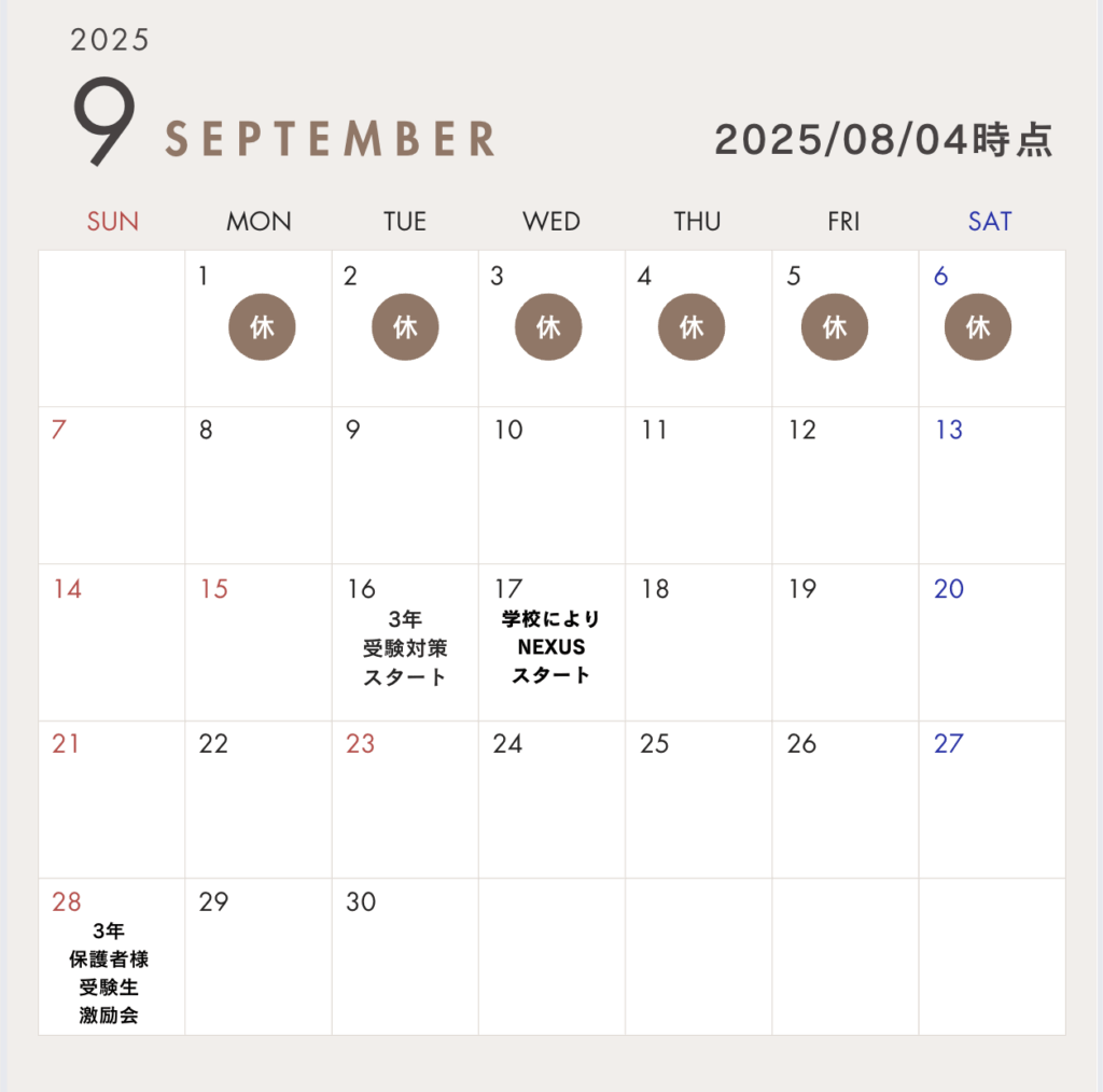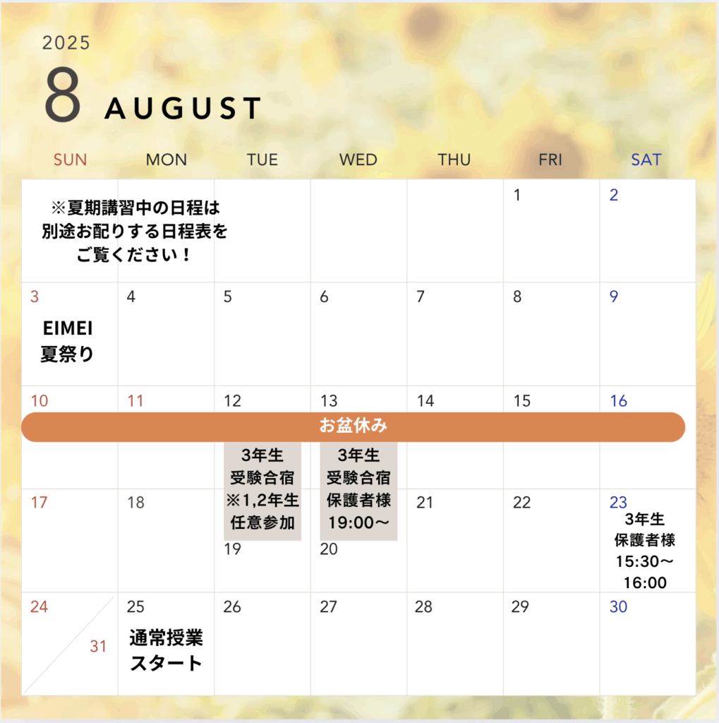 【羽沢】8月&9月の予定 2025/08/04時点 投稿日 2025年8月4日 著者 ryo カテゴリー 富士見羽沢校舎 カテゴリー 明成個別富士見羽沢校舎 ※9月は祝日も授業は実施予定です!23日は中学生はテスト対策等を実施する可能性もあります! シェア ツイート LINE この記事を書いた人 ryo 記事一覧