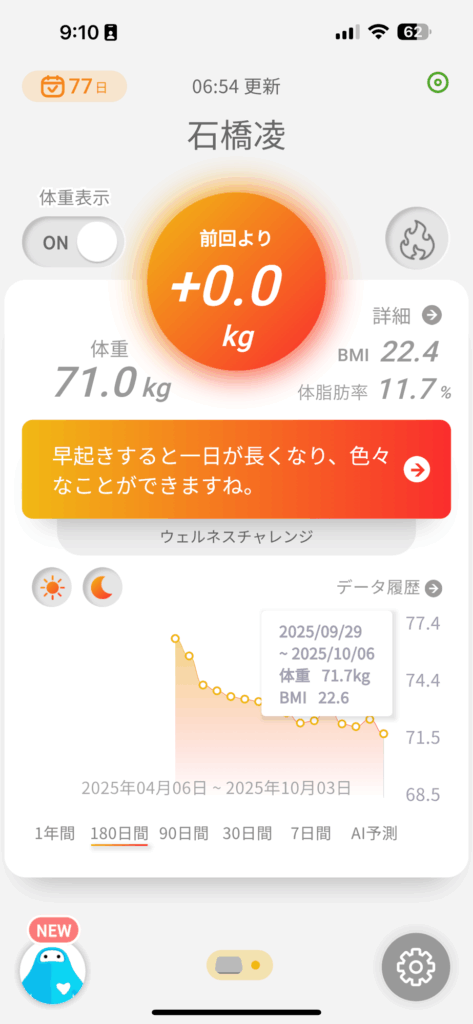 70kgくらいでちょうどいいかなと思ってるので、今度は過度に減らしすぎないようにしないと、、笑