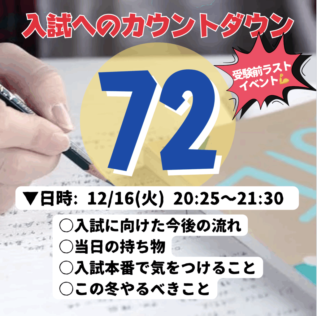 【羽沢】中3イベント 入試へのカウントダウン 投稿日 2025年11月20日 著者 ryo カテゴリー 富士見羽沢校舎 カテゴリー 明成個別富士見羽沢校舎 受験までの2ヶ月、改めて、事務的なことも、勉強的なことも、精神的なことも、大事なことを確認しましょう! 場所はエイメイ学院/明成個別にて行います! 中学部では最後の特別授業・イベントになります! 生徒はもちろん全員参加、保護者様もできればご参加ください💪 ※この日時は、通常授業がある人がほとんどかと思いますが、合格講座、通常授業等の時間を早めたり、別日に少し移動したりして授業分はしっかりと実施しますのでご安心ください! シェア ツイート LINE この記事を書いた人 ryo 記事一覧