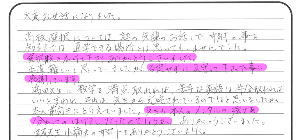 先生も本人のメンタルの強さを分かってのはげましだったのでしょうか。ありがとうございました。