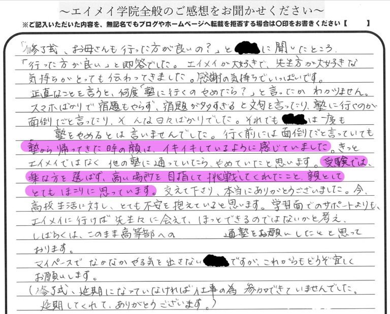 【ふじみ野】「親から見たエイメイ」 ~保護者様の受験体験記⑱~2024 投稿日 2024年3月11日 著者 おいたん カテゴリー エイメイ学院ふじみ野校舎ブログ カテゴリー おいたんのブログ カテゴリー ふじみ野上福岡校舎 小学部から息子の事を温かく見守って頂きありがとうございました。 先生方が一生懸命サポートしてくれているのに。 勉強面では、成長を見ることが出来ず残念でした。 私立の単願で受験させる事が息子にとって良い事なのか悩みました。 今もこの選択が正しかったのか分かりません。 高校では、努力する姿、頑張る息子をたくさん見たいです。 シェア ツイート LINE この記事を書いた人 おいたん 記事一覧